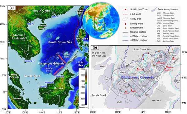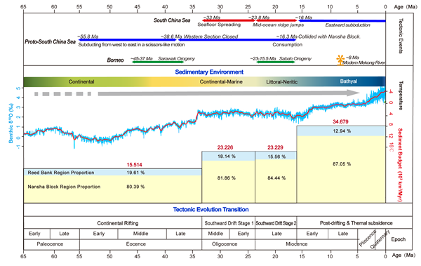 南沙地区位于南海南部陆缘,新生代以来经历陆缘拉张-漂移裂解-俯冲碰撞等一系列复杂的构造演化过程,使得其由中纬度逐渐漂移至低纬度现今位置,移动距离超过1300km。古地理环境上,南沙地区由陆相转向海相;在新生代东亚季风系统的形成和加强下,南沙地区周缘河流如湄公河、拉让河以及低海平面时期巽他陆架出露形成的北巽他河输送了大量的沉积物。多阶段的构造事件和古地理环境的变化导致了南沙地区沉积环境和沉积过程的显著变化,使其成为研究亚洲大陆边缘“源-汇”过程的独特组成部分。