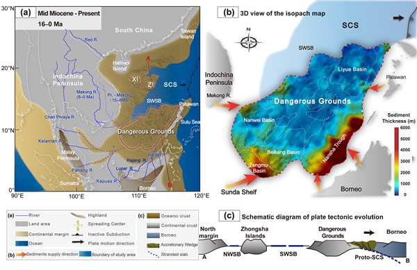 (a)区域沉积环境;构造单元位置基于Liu等(2023)在10Ma的板块运动学重建。古河流系统及其流向基于Burley等(2021)、Breitfeld等(2018, 2020, 2022)和Liu等(2017);(b)南沙地区沉积物等厚图及沉积物的输入方向;(c)为沿图(a)中剖面'AB'的板块垂向构造演化示意图,图示详细内容请参阅原文