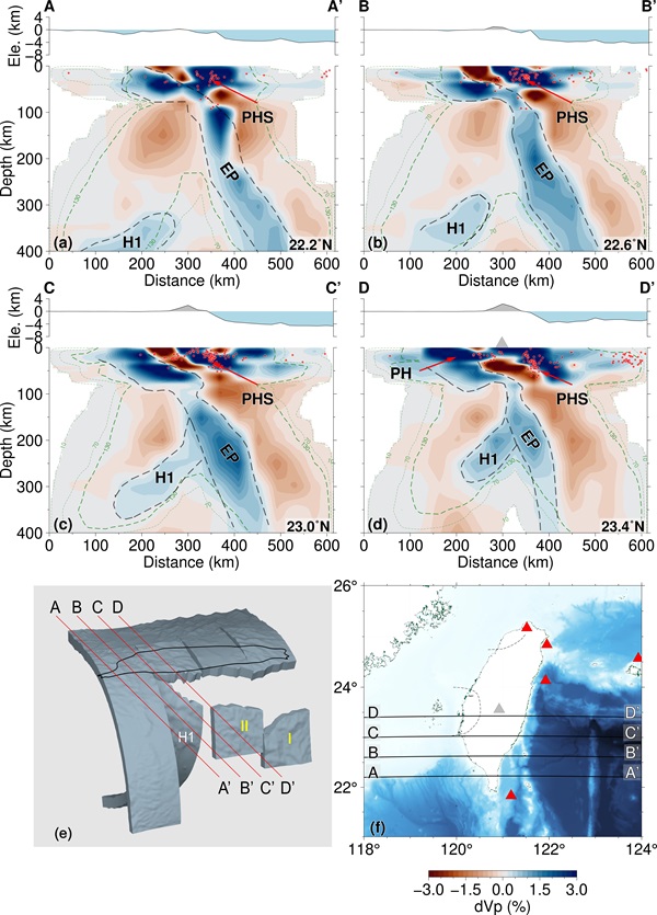 台湾地处欧亚板块和菲律宾海板块强相互作用区域,地震火山活动活跃。在台湾北部,菲律宾海板块沿琉球海沟俯冲到欧亚板块之下,而在台湾南部,欧亚板块沿马尼拉海沟俯冲到菲律宾海板块下方,这一现象称为俯冲极性反转。虽然前人针对台湾地区的深部构造已经开展了大量工作,但由于该地区构造环境的复杂性,造成俯冲极性反转的原因至今仍存在很大的争议。本次研究基于全球多个地震数据中心公布的地震台网记录到的远、近震P波数据,利用先进的远近震联合层析成像技术,揭示出欧亚板块在台湾北部发生折断和在台湾中部发生横向撕裂的现象,并结合地球化学、数值模拟、背景噪声成像、各向异性成像等多方面证据推断位于台湾西部的两个坚硬块体(Peikang High和Kuanying High)和剧烈的弧陆碰撞是造成欧亚板块发生破坏的重要原因。也正是由于欧亚板块破坏形成的缺口,使得菲律宾海板块可以进一步向西运动至欧亚板块之下,造成俯冲极性反转的发生。而在台湾南部,由于吕宋岛弧和欧亚板块只是处于相互作用的初期阶段,因此欧亚板块在其下方并未遭到破坏。