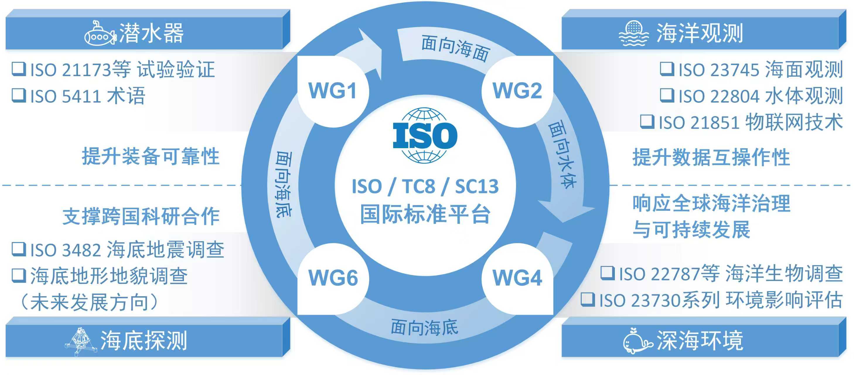 图 1 海洋观测和探测技术ISO国际标准发展框架. WG: 工作组