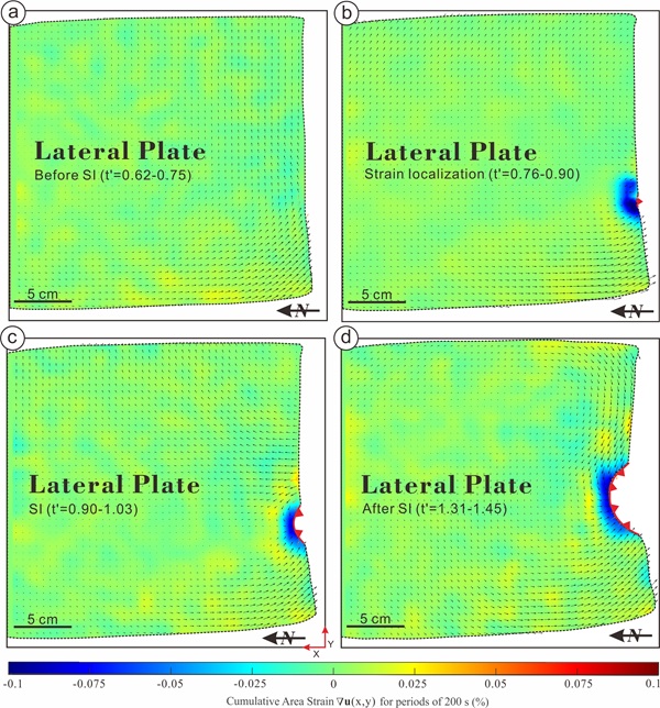 图中展示X与Y轴方向的正应变之和 (∇u(x,y)=ε_xx+ε_yy), 其中红色表示正值(伸展), 蓝色表示负值(挤压). (a) 侧边板块俯冲起始前,应变呈现低幅度弥散分布; (b) 应变开始在板块边界处集中; (c) 侧边板块发生俯冲起始,板块边界产生明显挤压应变,反映侧边板块物质被弯曲并带入地幔. (d) 进入自持性俯冲阶段后,应变持续集中于新生的俯冲带区域.