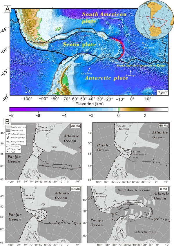 图 4 (A) 斯科舍俯冲带的区域构造图. (B) 斯科舍俯冲带及其邻区的板块重建 (80, 60, 40和0 Ma), 修改自Schellart et al. (2023).
