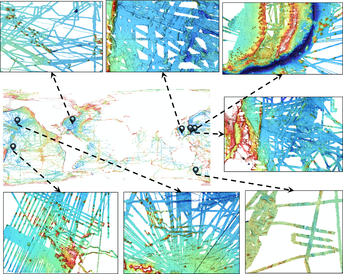 高分辨率的海底地形模型是“认知海洋、开发海洋、经略海洋”的基础。然而,受限于广阔的海域面积、以及当前以声呐为主的海洋探测技术的低效率,人类对海底地形的了解甚至远不如火星与月球表面,截至2025年,全球海底仅完成27.3%海域的海底地形精密测绘。单波束与多波束测深数据是构建高精度海底地形模型的核心数据源,然而,受巨大的海洋调查成本的限制,导致全球海底普遍存在实测数据“空洞”(图1),如何进行勘测“空洞”的有效修复,进而提升海底地形的完整性和使用价值是亟需解决的科技难题和挑战。