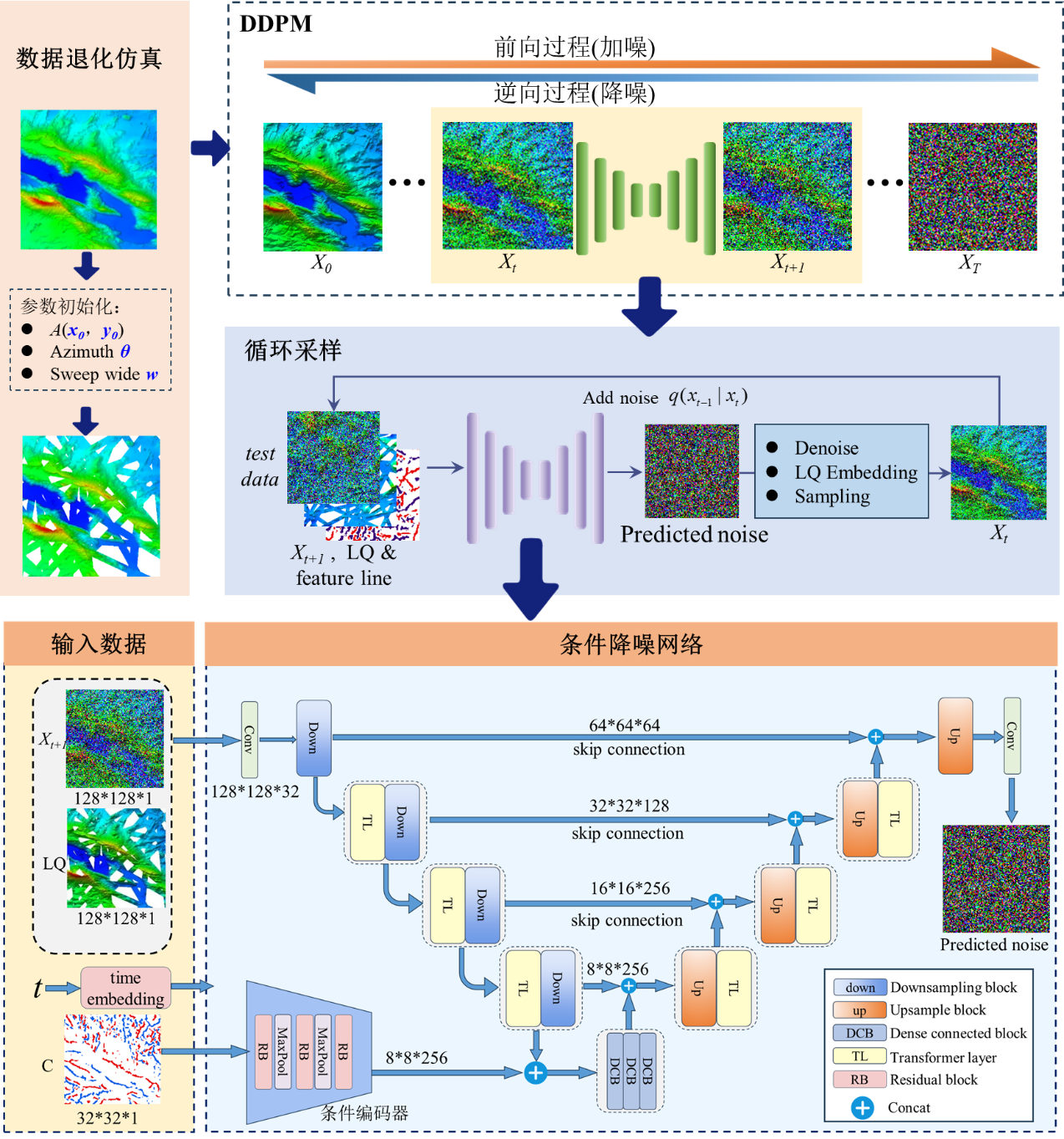针对上述难题,海底科学与划界全国重点实验室陈建兵博士(第一作者)和吴自银研究员(通讯作者)等提出了一种先验知识引导的测深数据空值区修复方法(图2)。该方法采用扩散模型的概率生成机制,并将V32重力异常模型作为先验知识嵌入逆向扩散过程,为模型提供了一张宏观的“海底地形框架图”,引导条件降噪网络在其每一步降噪过程中都能准确把握地形走向。最后,针对模型生成结果与原始测量数据可能存在的高程跳变,设计了循环采样机制,确保修复区域能够与周围的真实测量数据无缝衔接,避免了修复后出现“台阶”现象,最终实现与真实海底地形走势一致的空值区修复。