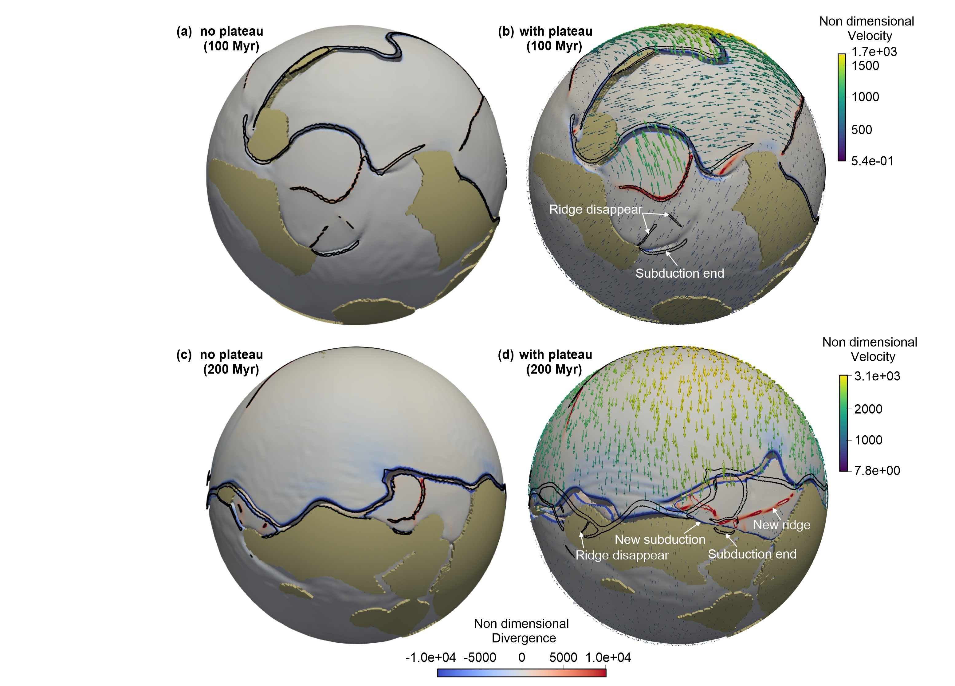 (a,c)分别展示了无海底高原俯冲的参考模型,而(b,d)则分别展示了有海底高原俯冲的实验模型。渲染表面为温度等值面,颜色根据散度而定,黑色实线代表参考模型(M0h),洋脊为橙色,海沟为浅蓝色,箭头表示表面速度。